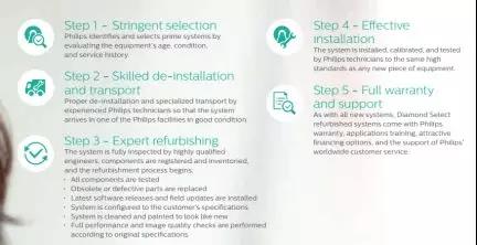飛利浦的醫(yī)療設(shè)備翻新業(yè)務(wù)被稱為Diamond Select項(xiàng)目,由五個步驟組成: