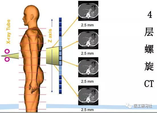 多層螺旋CT奠定了現(xiàn)代CT的設(shè)計架構(gòu),是CT技術(shù)的第二次飛躍。她創(chuàng)造性地在Z 軸上設(shè)置多排探測器,機架旋轉(zhuǎn)一周能獲得多幅斷層圖像,提高掃描速度和圖像縱向分辨率。從此,各大CT廠商開始“拼探測器”!