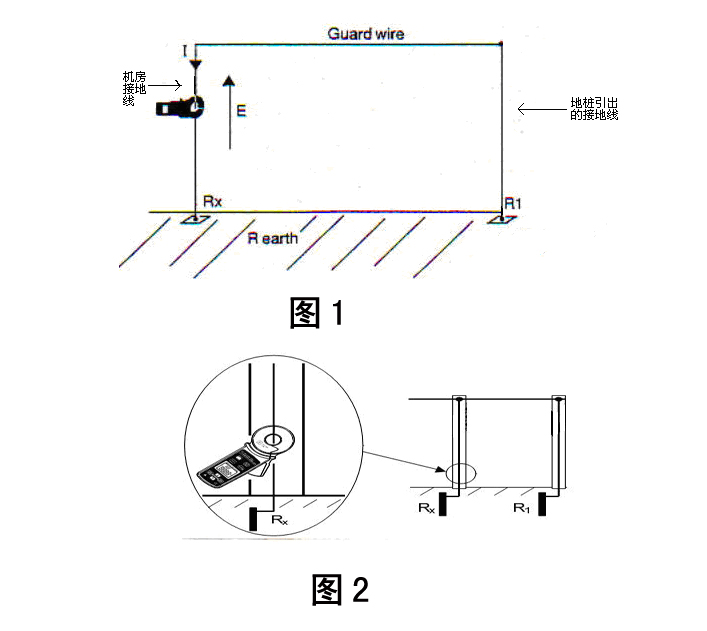 1、如果以機房為中心的半徑10米范圍內(nèi)沒有用作檢測的輔助接地裝置,則需在原機房接地裝置的1平方米面積中再次打入一根深度不小于1.0——1.5米的地樁作為檢測回路的輔助接地端。再從其地樁上引出一根截面積不小于16平方毫米的黃綠銅質(zhì)接地線與機房原接地相連形成檢測回路(如圖1所示)。打開鉗型接地電阻測試儀,切換到電阻測量功能,將儀器套住機房接地線端(如圖2所示),即可測得機房的接地電阻阻值Rx。按要求,所測得的接地電阻阻值應不大于4歐姆。同理將測試儀套住獨立接地裝置引出的黃綠接地線,可測得輔助接地裝置的接地電阻阻值R1。