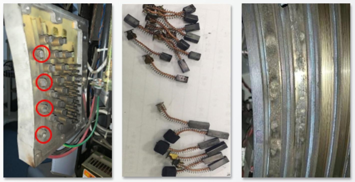 ② 滑環(huán)打火, 電源環(huán)碳粉積累,環(huán)面未能定期檢查清理,以及滑環(huán)刷組碳粉累積、刷頭過度磨損等會(huì)造成打火, 有時(shí)連帶造成高壓部件和其它電路部件的損壞。