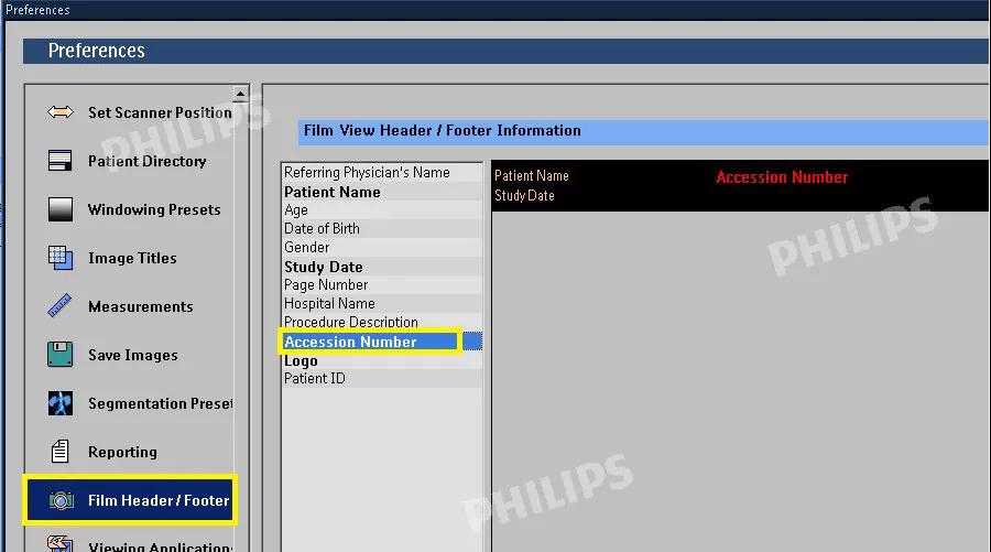 確認(rèn)登記患者有Accession Number后確認(rèn)自助打印識(shí)別Accession Number的位置。在Preferences中點(diǎn)擊Film Header/Footer,然后鼠標(biāo)左鍵按住菜單中的Accession Number拖動(dòng)至需要顯示的位置。