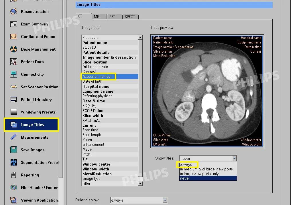 如果是在圖像中識(shí)別Accession Number, 則在Preferences 中點(diǎn)擊Image Titles,菜單中選中 Accession Number。在Show titles下拉菜單中選取always,隨后在上面預(yù)覽中將Accession Number左鍵按住拖動(dòng)至所需位置。