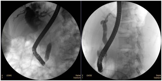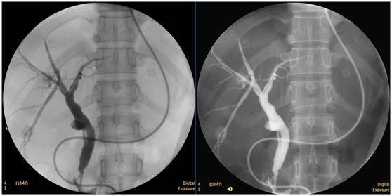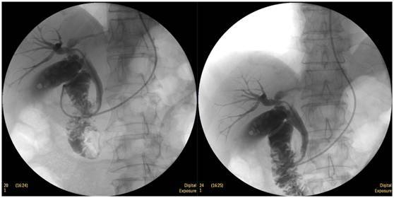 立位注入造影劑,膽總管顯影好,稍擴(kuò)張,未見結(jié)石影。