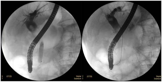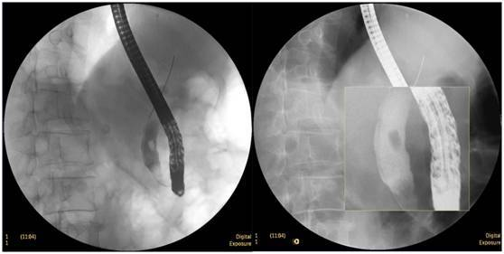 柱狀球囊擴(kuò)張完全,膽總管擴(kuò)張,下段見充盈缺損影。