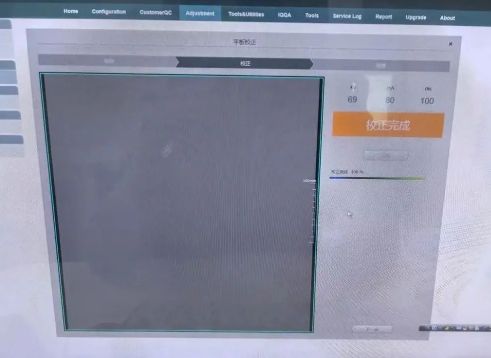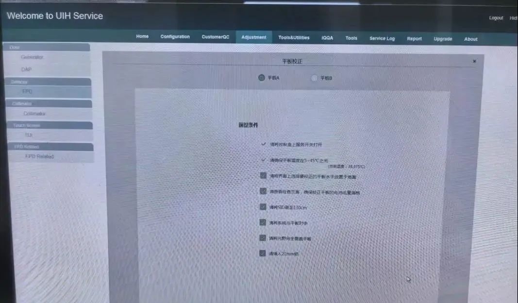 1. 打開軟件服務(wù)界面,隨后打開 adjustment-detector-FPD 界面,準(zhǔn)備對兩個無線平板進行依次校準(zhǔn),校準(zhǔn)順序為先 A 平板(床),再 B 平板(胸片架),兩者均為無線平板,可直接拆卸。